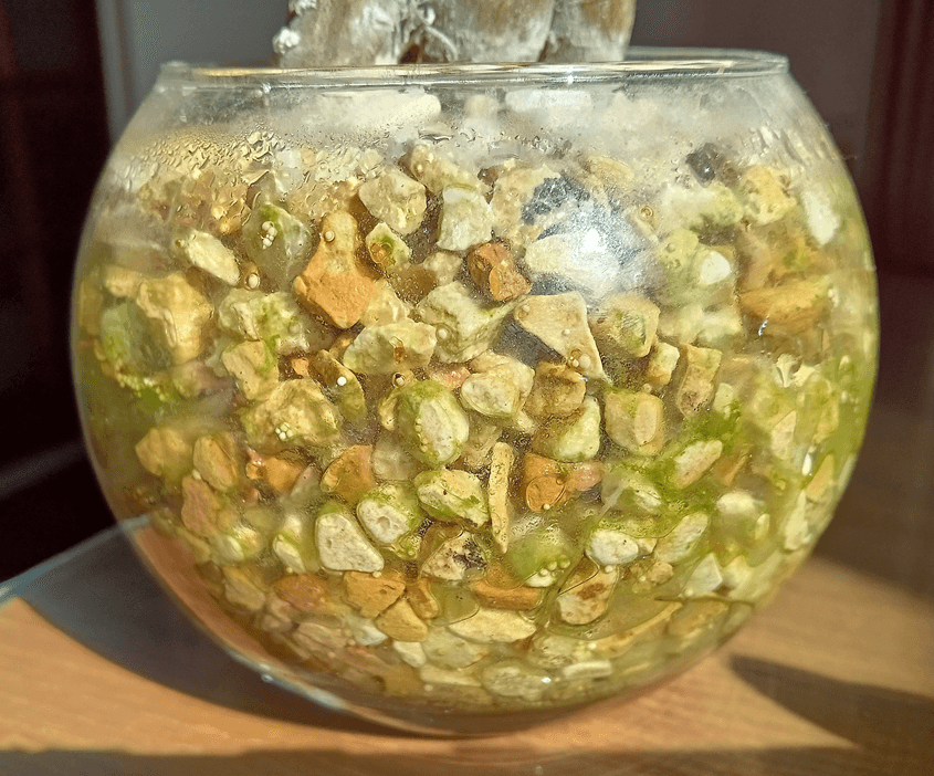 藻が大量発生したので... 葉っぱとゼオライトの表面には日を当てるけど、ガラス容器には日を当てない... どうしよう?