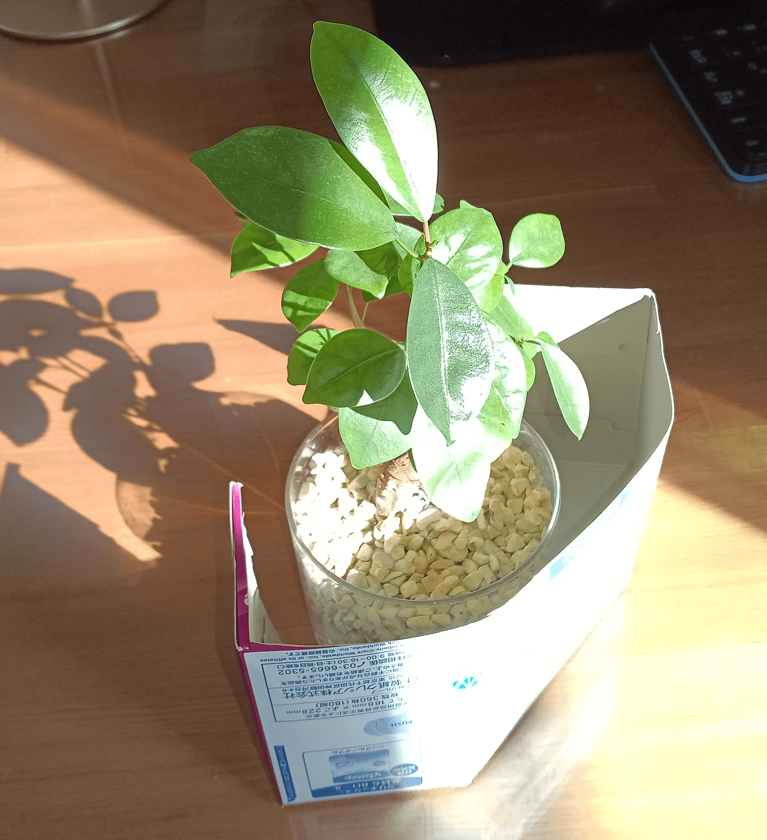 入れ替えました。あとは、ガラス容器のままだけど、葉っぱだけに日を当てる方法をどうするかだな。