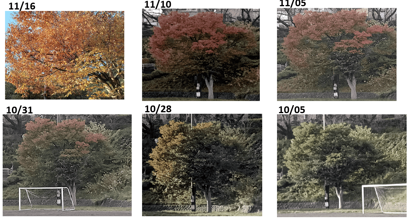 葉っぱが落ちてる。木を見てみたら、黄色のが出始めている
