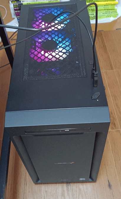 IIYAMAの LEVEL∞です。ゲーミングPCらしく横面スケルトンで、ファンがカラフルです。